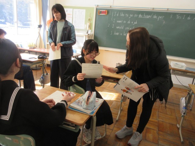 続く4限目は英語の授業において、ALTの先生と一緒に英会話・英作文トレーニング。ALTの先生が投げかけるお題(質問)に対して「Yes/No」等で答え、その理由をペアで述べ合った後、英文で記述していきます。「未来と過去のどちら行きたい?」「中学生がスマホを持つことについて」「AIは必要だと思う?」…こういった自分の意見・考えを英作文する課題もおそらく入試で出題されるのではないでしょうか。英語担当の先生やALTの先生にサポートしてもらいながら、粘り強く取り組む3年生の姿を見ることができました。