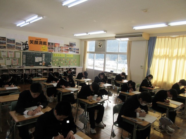 昨日〔2/5(木)〕から始まった1・2年生の確認テスト、3年生の学年末テストですが、本日〔2/6(金)〕の1・2限目の社会・理科の2教科をもって、全学年テストを終えました。