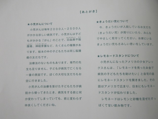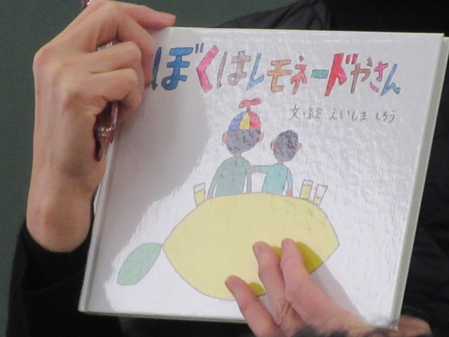 ボランティアさんが読んでくださった絵本の題名は「ぼくはレモネードやさん」。小児がんをテーマに書かれた本でした。