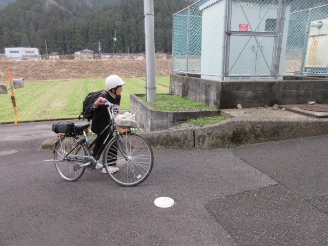 自転車通学になると、生徒は校舎裏側の道から自転車小屋へと入ってくるので、今日は生徒玄関前ではなく、裏手の道口で登校する生徒を出迎えました。