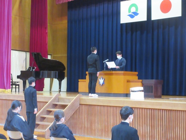 一方、国家斉唱・式歌合唱・校歌斉唱については、マスクを着用していたことや感染症拡大防止を考慮したこともあり、全体的に控えめの歌声となりました。全校生徒の100%の歌声は式本番まで取っておく…と言うことで、2日後にはパワー全開、体育館に響き渡る歌声が聞けることを期待しています。