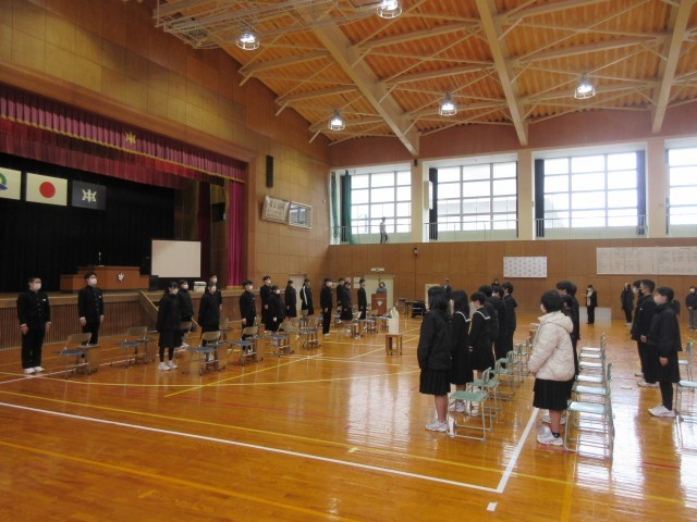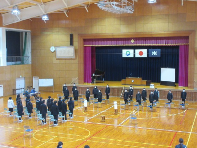 こうした3年生の姿を後ろから見守る1年生の態度も立派なものでした。礼儀やマナーを重んじる非日常的な空間に身を置き、改めて厳粛な式にするための心構えを作ることができたことでしょう。気は早いですが、「2年後には自分たちが…」との思いをもって、3年生の後ろ姿を見つめていた1年生もいたかもしれません。