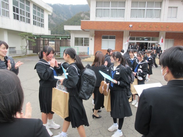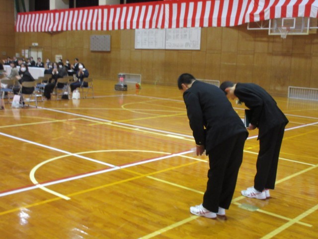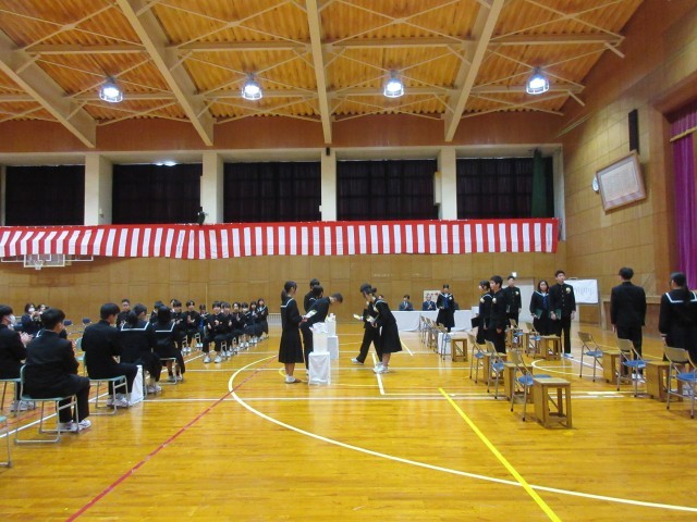 登校後、式開始までの時間ですが、3年教室では音頭を取る生徒がいて、自主的に歌練習を行っていたそうです。おそらく1・2年生も本番を前に、声出しや歌練習に取り組んでいたのではないでしょうか。「思い出に残る卒業式にしたい」「3年生のために卒業式を盛り上げたい」…そんな卒業生・在校生の「願い」の声が聞こえてきそうな感じがしました。