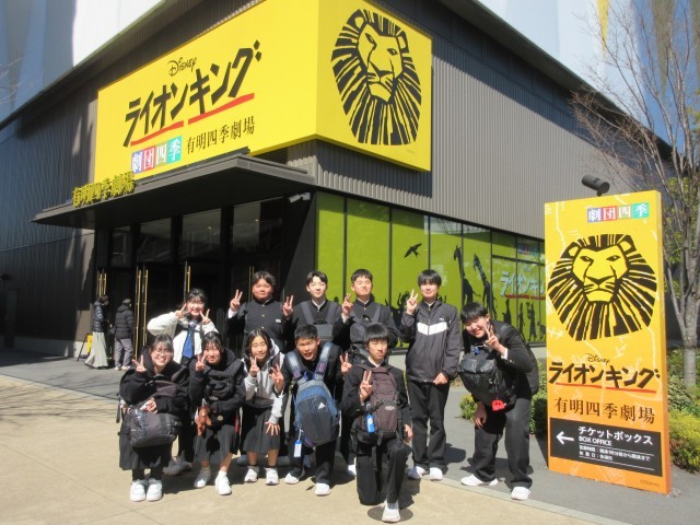 1日目の活動は、有明四季劇場にてミュージカル「ライオンキング」の鑑賞。会場2階席からの鑑賞でしたが、迫力ある演技と美しい音楽に冒頭から圧倒されました。独創的な舞台セットや演者がまとう衣装は、まるでアフリカサバンナの大自然にいるかのような華やかさ。その中で個性豊かなキャラクターたちが生き生きと動き回る様子はまさに圧巻。起承転結のストーリー展開に、最後は心温まるハッピーエンド…3時間に渡る舞台鑑賞でしたが、2年生にとって心に残る感動体験となったことでしょう。また、来年の学校祭のステージ発表に向けて、大いに参考となったのではないでしょうか。ちなみに生徒から率直な疑問が一つ…「あの子役の子は、今日学校行ってないんかな…」。