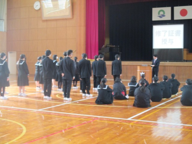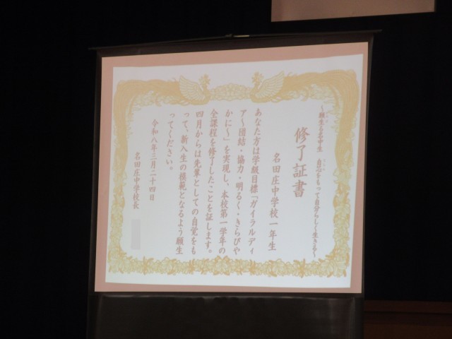 修了式は、1年間の学業を修めたことを証し、次なるステージの学年に上がることを認定する儀式です。そこで、この度1・2年生への「修了証書授与式」を行いました。呼ばれた学年の生徒は全員で返事をして一同に起立。その後、各学年の代表生徒が前に出てきて、修了証書を受け取りました。あくまでオリジナル証書ですが、学年の締めくくりとなる修了日を形あるものに残したいと思い、各学年に一枚ずつ作成して授与しました。互いの「願生り」を認め合い、讃え合うことにもつながることを願っています。