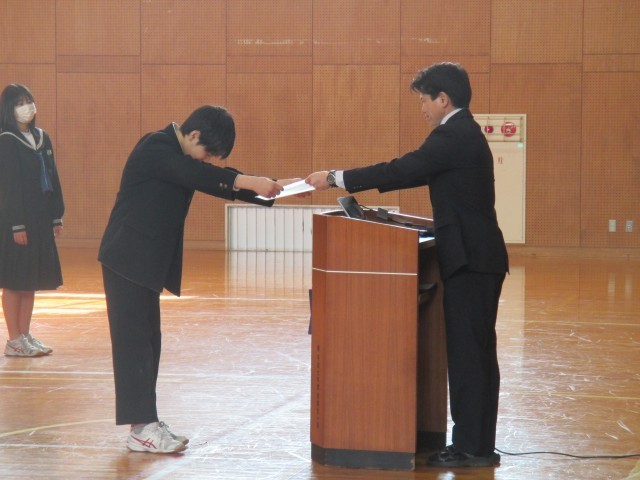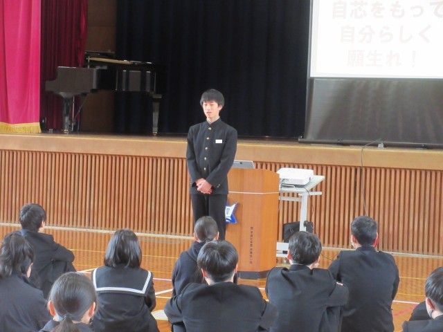 来る新入生との出会いは、1・2年生の皆さんにとって「先輩・上級生としての自覚」を促すチャンスとなるでしょう。これまでの中学校生活で培ってきた力に自信をもち、胸張って新入生を迎えてもらいたいと思います。「春休みを機会に自分を成長させる」…そんな気持ち(願い)をもって、有意義な14日間を過ごしてくれることを期待しています。新年度・新学期に向けて、自芯をもって自分らしく願生れ!