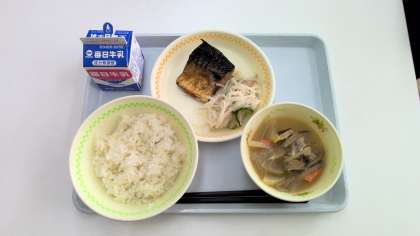 本日の給食は、麦ごはん、牛乳、さばの醤油焼き、米粉めんのサラダ、豚汁でした。本日も大変おいしくいただきました。